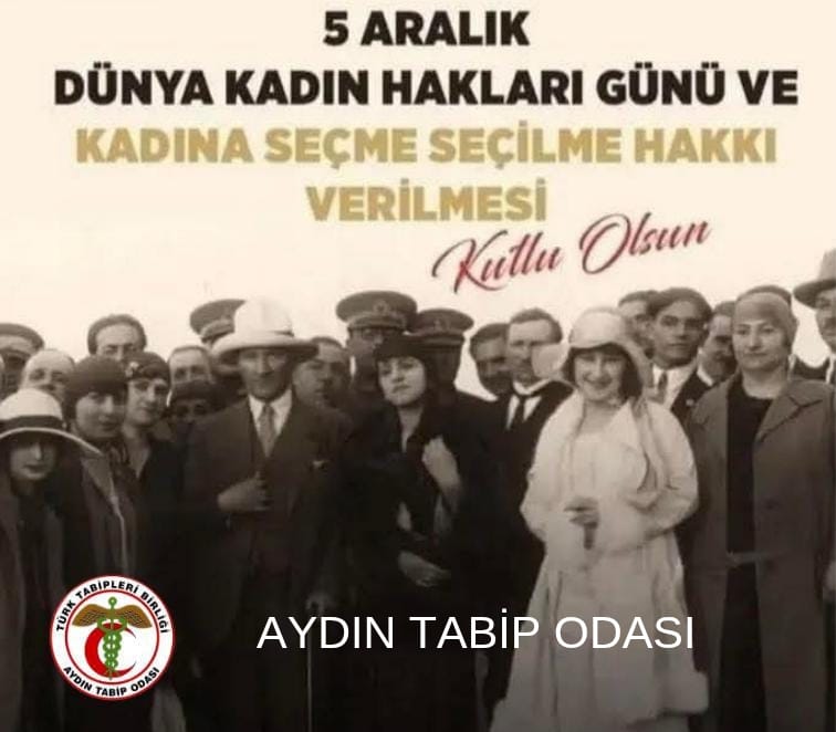 5 Aralık Dünya Kadın Hakları Günü ve Kadına Seçme ve Seçilme Hakkı Verilmesi günü kutlu olsun. #5aralıkdünyakadınhaklarıgünü İlgili Haberler Sağlıkta Şiddetle Mücadele Günü17/04/2026 Tıbbi Mümessiller Günü15/04/2026 Aydın Tabip Odası Genel Kurulu – 202612/04/2026