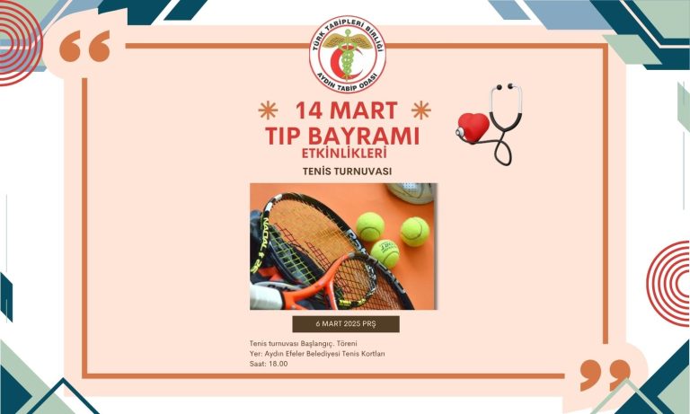 14 Mart Tıp Bayramı EtkinlikleriTenis Turnuvası Sonuçlandı Aydın Tabip Odası 14 Mart Tıp Bayramı etkinlikleri kapsamında geleneksel olarak yapılan 14 Mart Tenis Turnuvası bu yıl 20 erkek , 7 kadın oyuncunun katılımı ile gerçekleşti. 6 Mart 2025 tarihinde başlayan turnuva,…